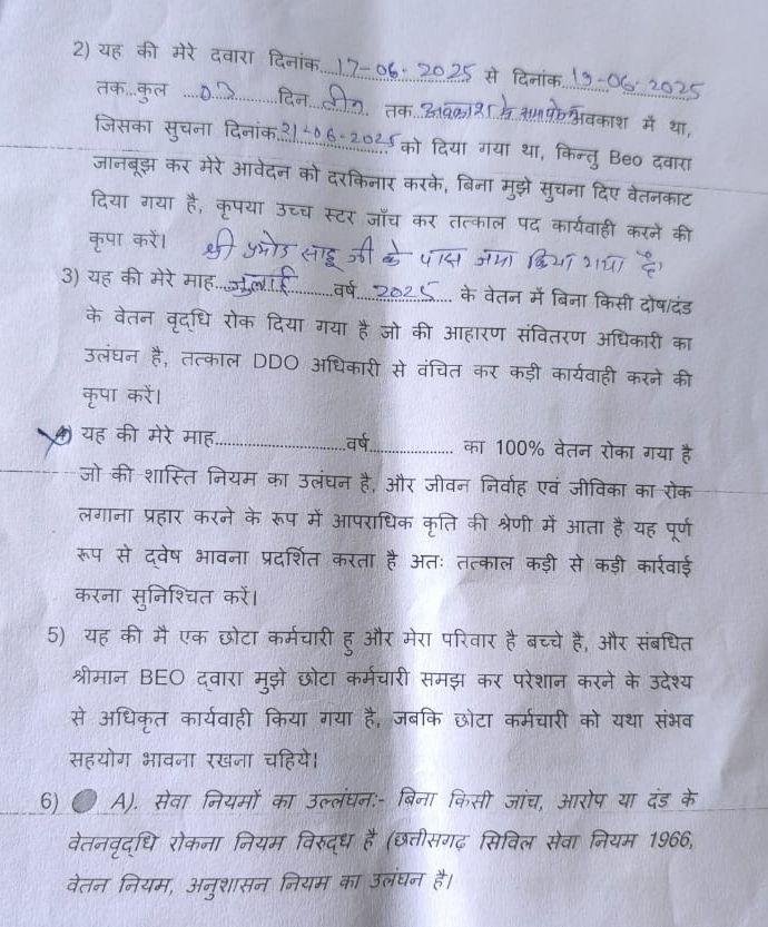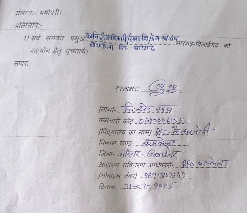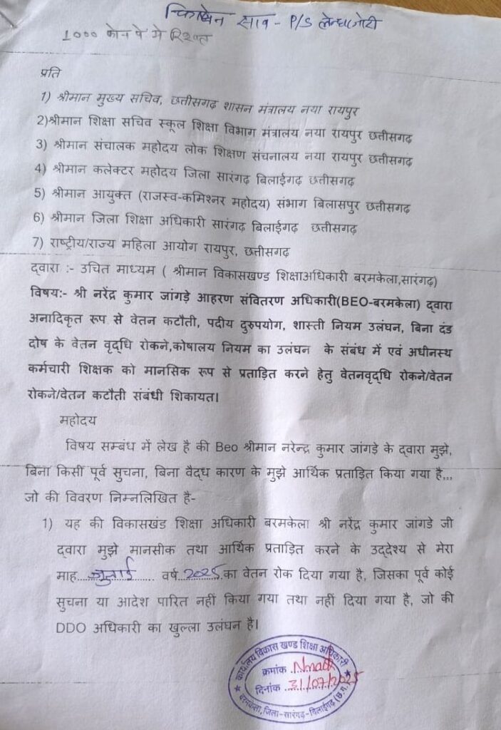 BEO नरेंद्र कुमार जांगड़े पर आरोप है कि उन्होंने बिना किसी वैध प्रक्रिया अपनाए, वेतन वृद्धि भी रोक दी और शिक्षकों द्वारा प्रस्तुत आवेदन को दरकिनार कर दिया।