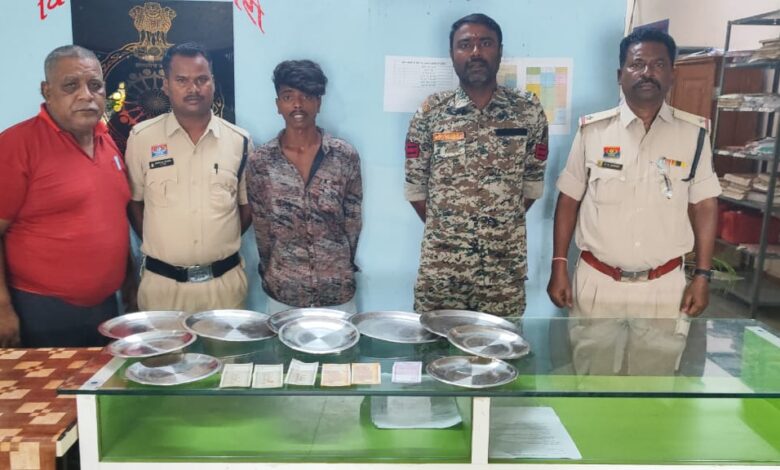 जिसमें मुखबिर से सूचना मिली कि प्रकाश उर्फ सागर सारथी उर्फ चेमे (उम्र 21 वर्ष), निवासी तुर्रापारा, वार्ड क्रमांक 4, धरमजयगढ़, इस चोरी में संलिप्त है। पुलिस ने आरोपी को उसके घर से हिरासत में लेकर पूछताछ की, जिसमें उसने जुर्म कबूल किया । आरोपी से 5 बड़े स्टील प्लेट और 5 छोटे स्टील प्लेट और ₹2000 नगदी जप्त किया गया है, बाकी बर्तन उसने डर से मांढ नदी के पुल से नीचे फेंक दिए और ₹13,000 खर्च कर दिए। आरोपी की निशानदेही पर झाड़ियों से बर्तन बरामद कर गवाहों के समक्ष जप्त किया गया।